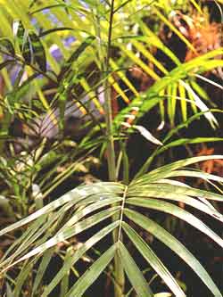 คล้ายใบไผ่ยาวประมาณ 6 นิ้วและกว้างประมาณ 1 นิ้ว ปาล์มไผ่นี้สามารถประดับไว้ในที่ทึบแสง
