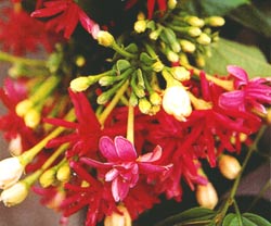 ประมาณ 4 นิ้ว ตรงปลายดอกจะแยกออกเป็น 5 กลีบ ดอกมีสีแดงอมขาว หรือสีชมพู หลอดของ