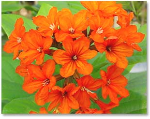 กลม โคนมน ผิวใบสากมือ สีเขียวสด ดอกเป็นสีแสดแดง หรือ สีส้ม ออกเป็นช่อ กระจุกที่ปลายยอด